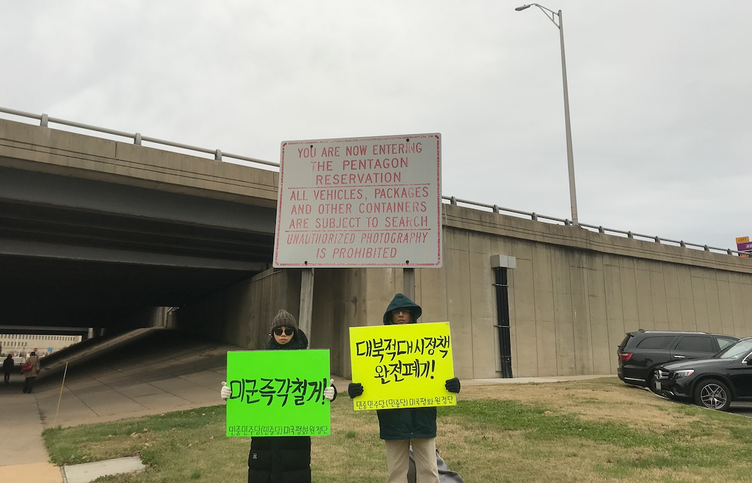 민중민주당(민중당) 미국평화원정단은 7일(현지시간) 워싱턴D.C백악관앞에서 <미군즉각철거!>, <북침전쟁연습 영구중단!>, <대북적대시정책 완전폐지!> 등을 촉구하는 평화시위를 총1310일째 진행했다.
