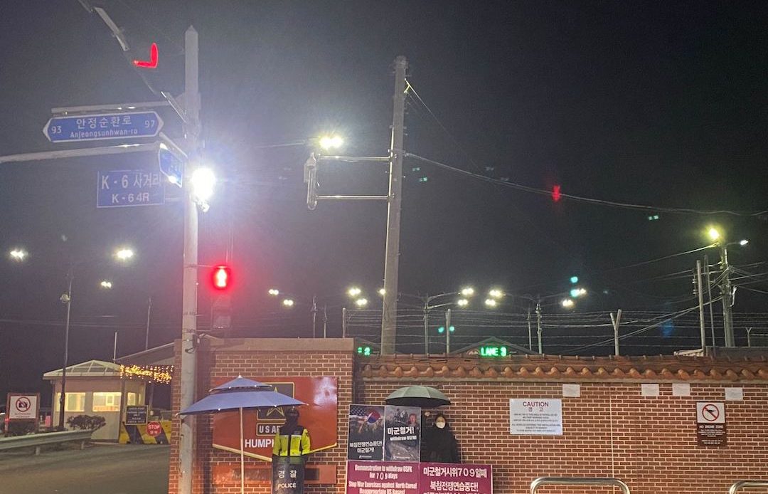 주남미군사령부가 있는 평택험프리스기지앞에서는 <북미협상결렬 트럼프규탄!>·<전쟁연습중단! 미군철거!>구호피시를 들고 미군철거시위를 709일째 진행했다.