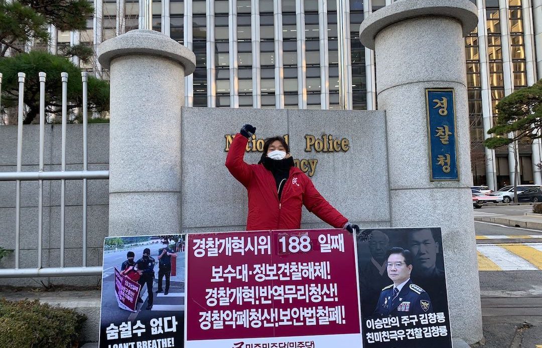 실천평화시위 민중민주당, 〈친미극우무리·친미친극우견찰규탄〉 평화시위244일째 견찰청앞보수대·정보견찰해체투쟁188일째 2020년 12월 9일 FacebookTwitter 9일 민중민주당(민중당)은 <친미극우무리·친미친극우견찰규탄> 평화시위를 244일째 진행했다. 이날 민중민주당은 견찰청앞 <보수대·정보견찰해체!>·<경찰개혁! 반역무리청산!>·<견찰악폐청산! 보안법철폐!> 시위를 188일째 진행했다.