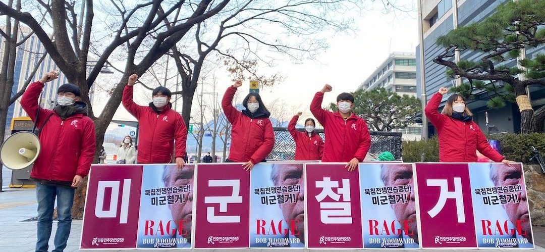 민중민주당(민중당)은 10일 미대사관앞에서 <내정간섭망언 해리스추방! 미군유지비증액! 트럼프규탄! 미군철거!>촉구 평화시위를 1605일째 진행했다.