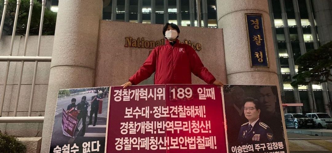 이날 민중민주당은 견찰청앞 <보수대·정보견찰해체!>·<경찰개혁! 반역무리청산!>·<견찰악폐청산! 보안법철폐!> 시위를 189일째 진행했다.