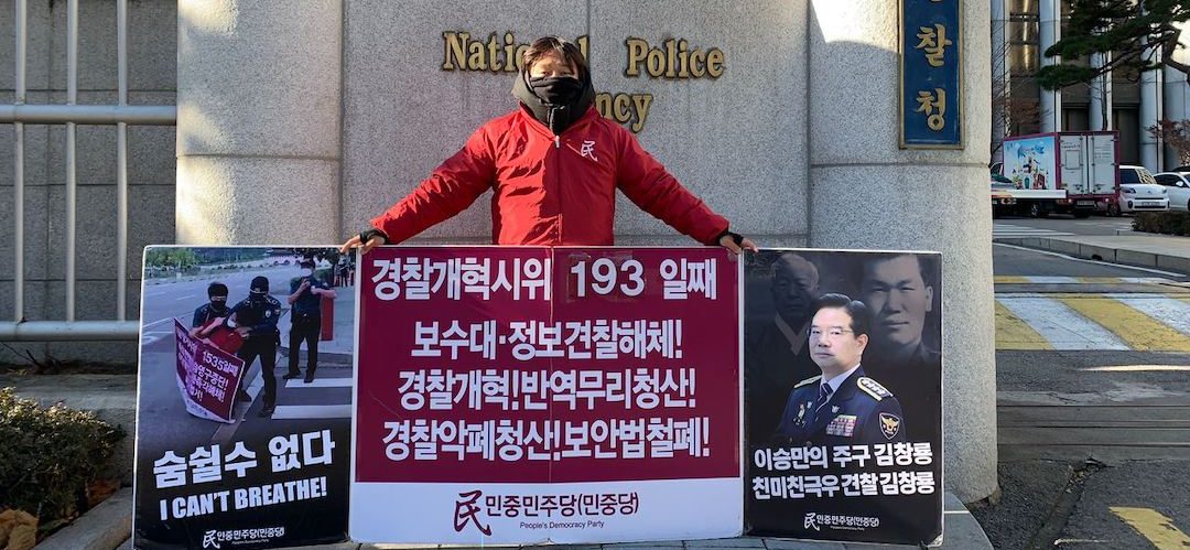 실천평화시위 민중민주당, 〈친미극우무리·친미친극우견찰규탄〉 평화시위249일째 견찰청앞보수대·정보견찰해체투쟁193일째 2020년 12월 14일 FacebookTwitter 14일 민중민주당(민중당)은 <친미극우무리·친미친극우견찰규탄> 평화시위를 249일째 진행했다. 이날 민중민주당은 견찰청앞 <보수대·정보견찰해체!>·<경찰개혁! 반역무리청산!>·<견찰악폐청산! 보안법철폐!> 시위를 193일째 진행했다.