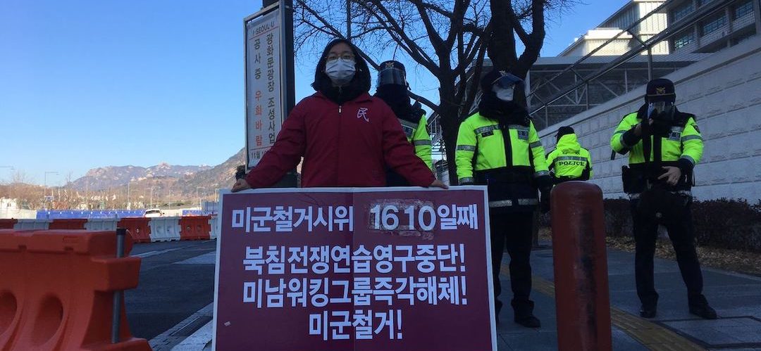 민중민주당(민중당)은 15일 미대사관앞에서 <내정간섭망언 해리스추방! 미군유지비증액! 트럼프규탄! 미군철거!>촉구 평화시위를 1610일째 진행했다.