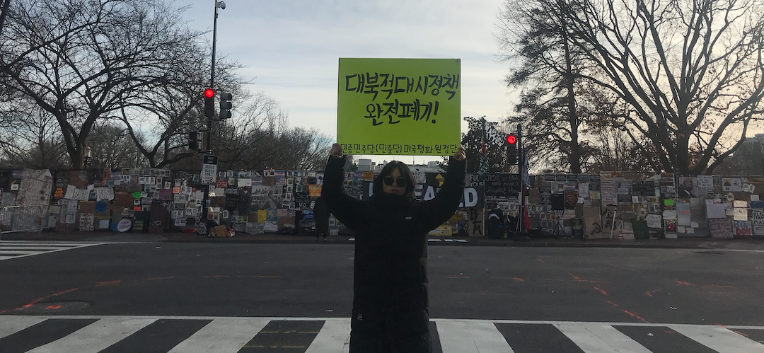 민중민주당(민중당) 미국평화원정단은 15일(현지시간) 워싱턴D.C백악관앞에서 <미군즉각철거!>, <북침전쟁연습 영구중단!>, <대북적대시정책 완전폐지!> 등을 촉구하는 평화시위를 총1318일째 진행했다.