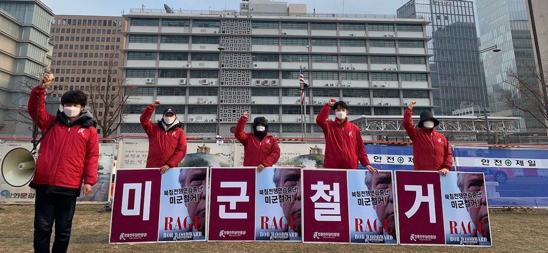 민중민주당(민중당)은 22일 미대사관앞에서 <북침전쟁연습영구중단! 미남워킹그룹즉각해체! 미군철거!>촉구 평화시위를 1617일째 진행했다.