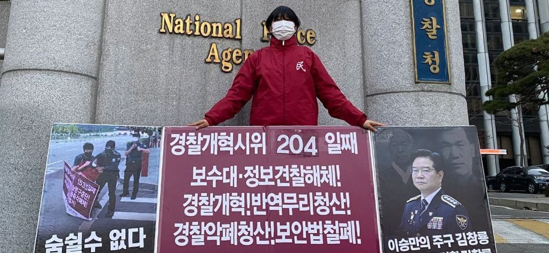 民평화시위실천 민중민주당, 〈친미극우무리·친미친극우견찰규탄〉 평화시위260일째 견찰청앞보수대·정보견찰해체투쟁204일째 2020년 12월 25일 FacebookTwitter 25일 민중민주당(민중당)은 <친미극우무리·친미친극우견찰규탄> 평화시위를 259일째 진행했다. 이날 민중민주당은 견찰청앞 <보수대·정보견찰해체!>·<경찰개혁! 반역무리청산!>·<견찰악폐청산! 보안법철폐!> 시위를 204일째 진행했다.