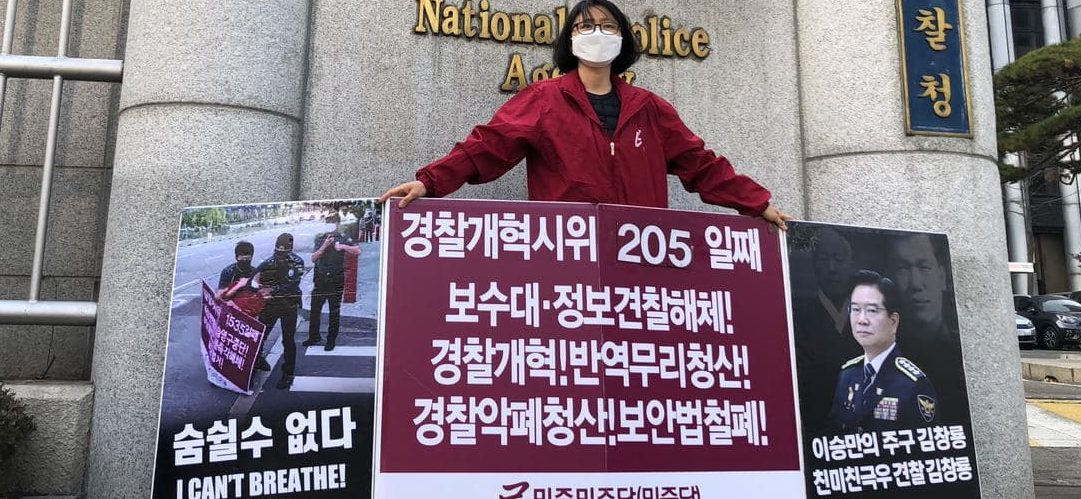 실천평화시위 민중민주당, 〈친미극우무리·친미친극우견찰규탄〉 평화시위261일째 견찰청앞보수대·정보견찰해체투쟁205일째 2020년 12월 26일 FacebookTwitter 26일 민중민주당(민중당)은 <친미극우무리·친미친극우견찰규탄> 평화시위를 261일째 진행했다. 이날 민중민주당은 견찰청앞 <보수대·정보견찰해체!>·<경찰개혁! 반역무리청산!>·<견찰악폐청산! 보안법철폐!> 시위를 205일째 진행했다.