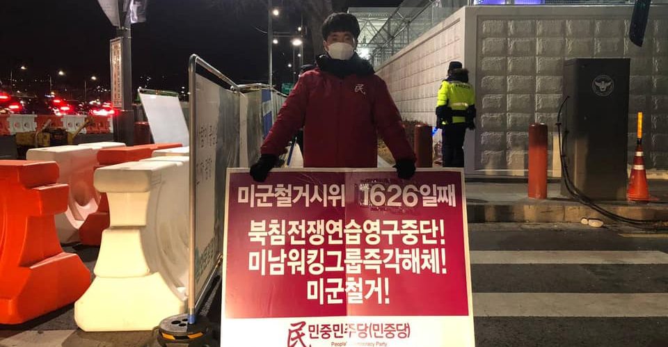 민중민주당(민중당)은 31일 미대사관앞에서 <북침전쟁연습영구중단! 미남워킹그룹즉각해체! 미군철거!>촉구 평화시위를 1626일째 진행했다.