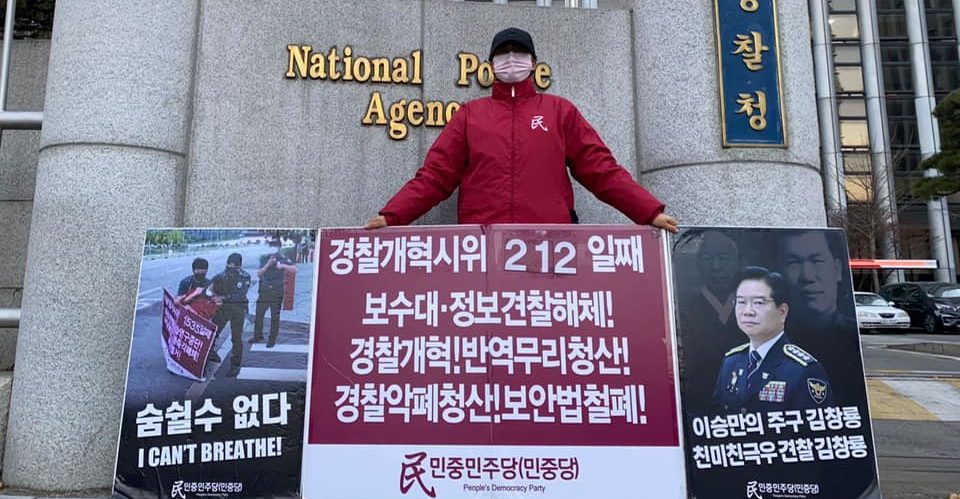 실천평화시위 민중민주당, 〈친미극우무리·친미친극우견찰규탄〉 평화시위268일째 견찰청앞보수대·정보견찰해체투쟁212일째 2021년 1월 2일 FacebookTwitter 2일 민중민주당(민중당)은 <친미극우무리·친미친극우견찰규탄> 평화시위를 268일째 진행했다. 이날 민중민주당은 견찰청앞 <보수대·정보견찰해체!>·<경찰개혁! 반역무리청산!>·<견찰악폐청산! 보안법철폐!> 시위를 212일째 진행했다.