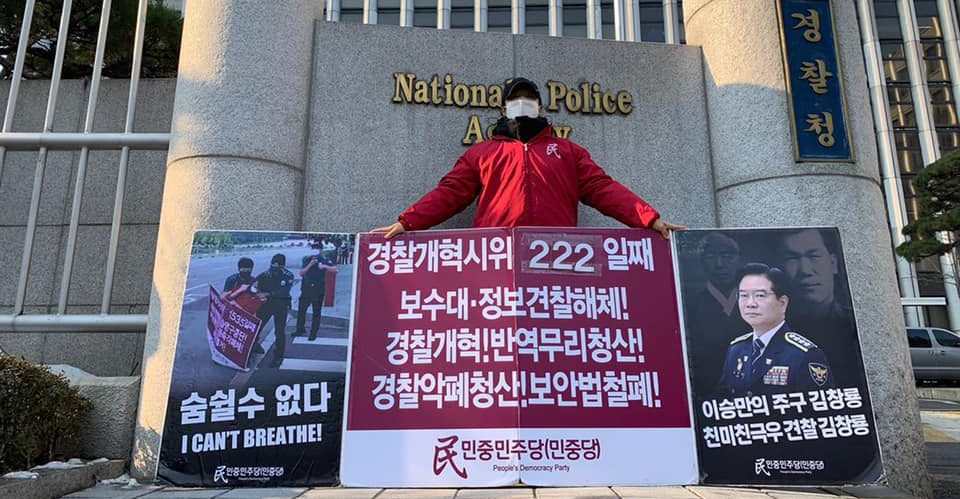 이날 민중민주당은 견찰청앞 <보수대·정보견찰해체!>·<경찰개혁! 반역무리청산!>·<견찰악폐청산! 보안법철폐!> 시위를 222일째 진행했다.