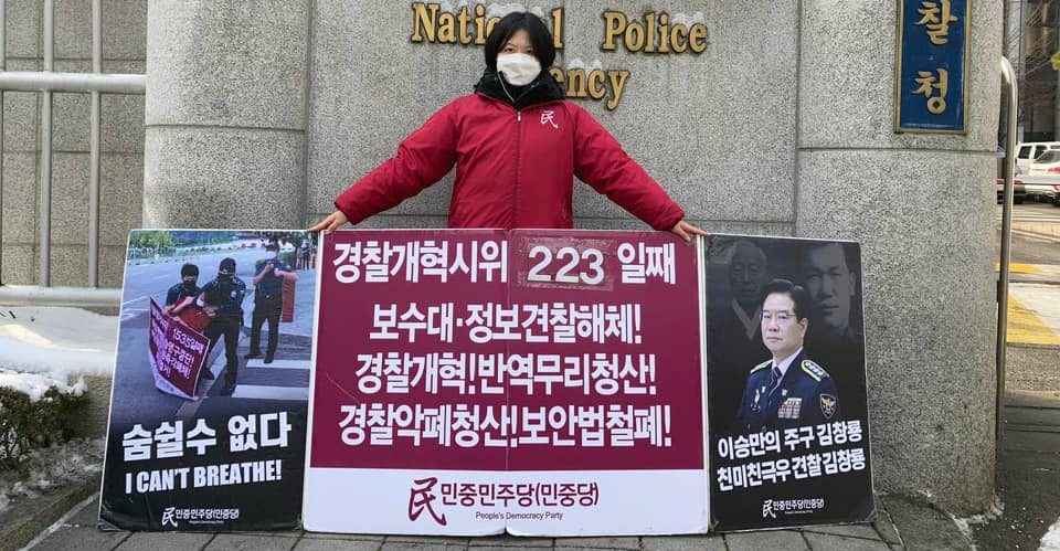 실천평화시위 민중민주당, 〈친미극우무리·친미친극우견찰규탄〉 평화시위279일째 견찰청앞보수대·정보견찰해체투쟁223일째 2021년 1월 13일 FacebookTwitter 13일 민중민주당(민중당)은 <친미극우무리·친미친극우견찰규탄> 평화시위를 279일째 진행했다. 이날 민중민주당은 견찰청앞 <보수대·정보견찰해체!>·<경찰개혁! 반역무리청산!>·<견찰악폐청산! 보안법철폐!> 시위를 223일째 진행했다.