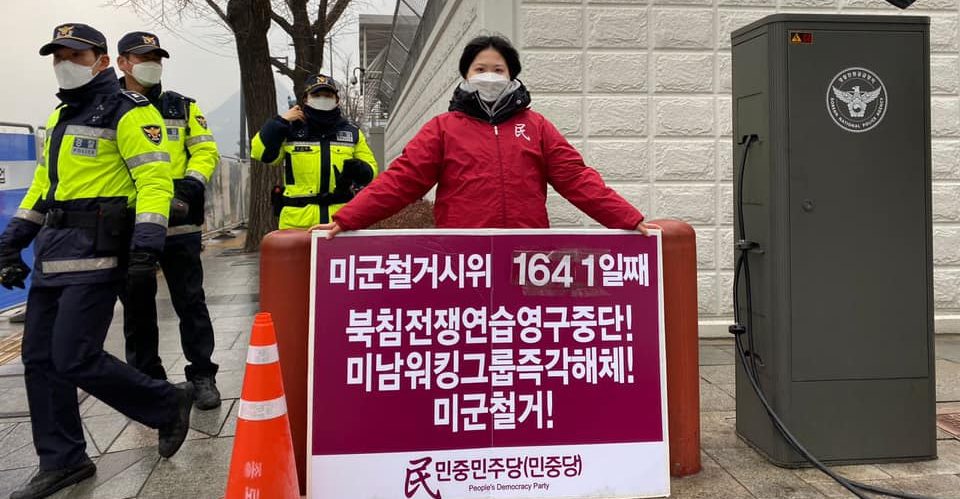 민중민주당(민중당)은 15일 미대사관앞에서 <북침전쟁연습영구중단! 미남워킹그룹즉각해체! 미군철거!>촉구 평화시위를 1641일째 진행했다.