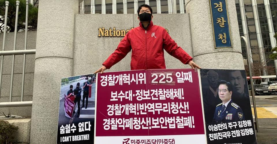 실천평화시위 민중민주당, 〈친미극우무리·친미친극우견찰규탄〉 평화시위281일째 견찰청앞보수대·정보견찰해체투쟁225일째 2021년 1월 16일 FacebookTwitter 15일 민중민주당(민중당)은 <친미극우무리·친미친극우견찰규탄> 평화시위를 281일째 진행했다. 이날 민중민주당은 견찰청앞 <보수대·정보견찰해체!>·<경찰개혁! 반역무리청산!>·<견찰악폐청산! 보안법철폐!> 시위를 225일째 진행했다.
