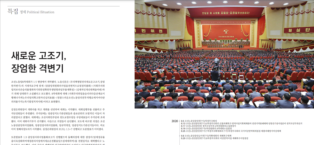 조선노동당8차대회가 1.5 평양에서 개막됐다. 노동신문은 <우리혁명발전의새로운고조기,장엄한격변기>의 시대적요구에 맞게 <당중앙위원회의사업을전면적으로엄정히총화>·<사회주의위업의보다큰승리를쟁취하기위한정확한투쟁방향과임무를재확정>·<실제적인개선대책을마련>하기 위해 당대회가 소집됐다고 보도했다. 8차대회에 대해 <사회주의위업을승리의다음단계로이행해나가려는우리당의확고한자신심의표출>·<영광스러운조선노동당의전투적행로에서커다란의의를가지는특기할정치적사변>이라고 표현했다.