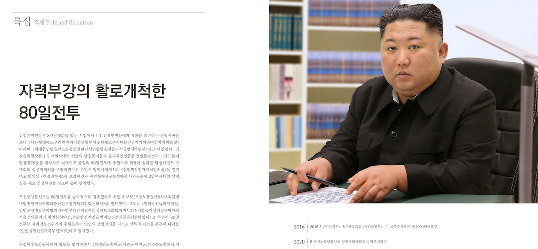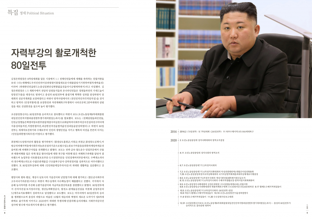 김정은위원장은 8차당대회를 앞둔 시점에서 1.1 전체인민들에게 새해를 축하하는 친필서한을 보내 <나는새해에도우리인민의이상과염원이꽃필새로운시대를앞당기기위하여힘차게싸울것> 이라며 <위대한인민을받드는충심일편단심변함없을것을다시금맹세하면서>라고 다짐했다. 김정은위원장은 1.5 개회사에서 전당의 당원동지들과 온나라인민들은 정면돌파전의 기세드높이 당창건75돌을 대경사로 빛내이고 충성의 80일전투에 총궐기해 혁혁한 성과를 달성하면서 당대회의 성공적개최를 보장하였다고 하면서 방역사업에서의 <전인민적인자각적일치성>을 견지하고 방역의 <안정적형세>를 보장한것과 자연재해복구투쟁에서 나라곳곳에 2만여세대의 살림집을 새로 건설한것을 짚으며 높이 평가했다.