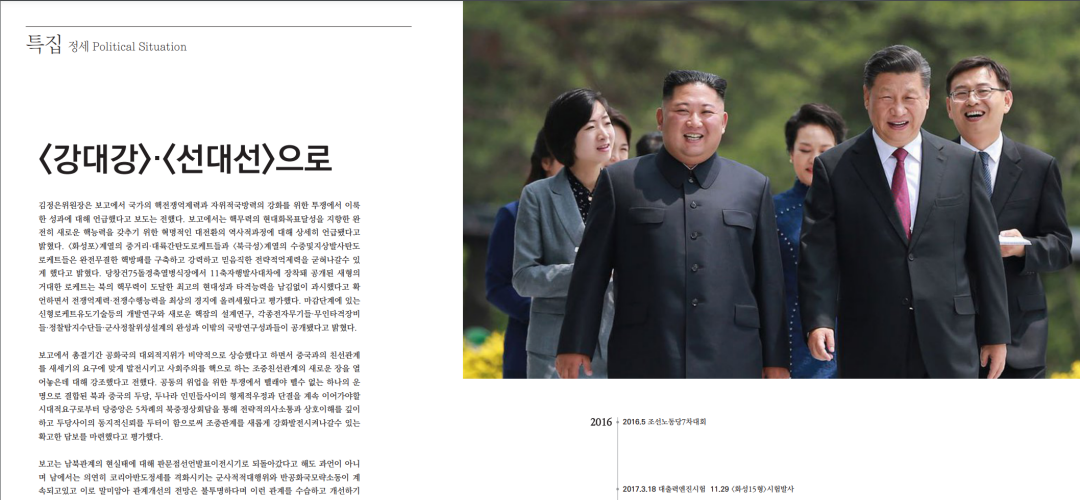 보고에서 총결기간 공화국의 대외적지위가 비약적으로 상승했다고 하면서 중국과의 친선관계 를 새세기의 요구에 맞게 발전시키고 사회주의를 핵으로 하는 조중친선관계의 새로운 장을 열어놓은데 대해 강조했다고 전했다. 공동의 위업을 위한 투쟁에서 뗄래야 뗄수 없는 하나의 운명으로 결합된 북과 중국의 두당, 두나라 인민들사이의 형제적우정과 단결을 계속이어가야할 시대적요구로부터 당중앙은 5차례의 북중정상회담을 통해 전략적의사소통과 상호이해를 깊이 하고 두당사이의 동지적신뢰를 두터이 함으로써 조중관계를 새롭게 강화발전시켜나갈수 있는 확고한 담보를 마련했다고 평가했다.