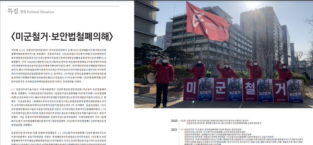 지난해 12.31 민중민주당(민중당)은 마석모란공원에서 논평<2021년새해를미군철거와보안법철폐의해로빛내이자!>를 발표했다. 민중민주당은 <(2020년을)<미군철거의해>로선포한만큼민중의생명과안전을최우선으로하고방역수칙을엄수하며다양한실천활동을창의적으로전개했다>고 총평했다. 이어 <2020년<대만위기설>은<제2의코리아전>과밀접히연관돼있고이중심에미국의제국주의패권야욕과금융자본집단의세계지배야욕이있다>라며 <특히대만과남중국해를둘러싼중국과미국,페르시아만을둘러싼이란과미국간의군사적긴장은코리아의통일을놓고벌어지는우리민족과미국과의대결전과밀접한관련이있다>고 분석하고 <우리민중·민족은올한해자신과민족의운명을개척하기위해분투해온성과를계승해2021년을반드시<미군철거의해>·<보안법철폐의해>로만들어민족자주·조국통일의새세상을앞당길것>이라고 신년결의를 다졌다.