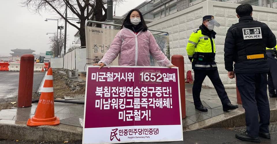 민중민주당(민중당)은 26일 미대사관앞에서 <북침전쟁연습영구중단! 미남워킹그룹즉각해체! 미군철거!>촉구 평화시위를 1652일째 진행했다.
