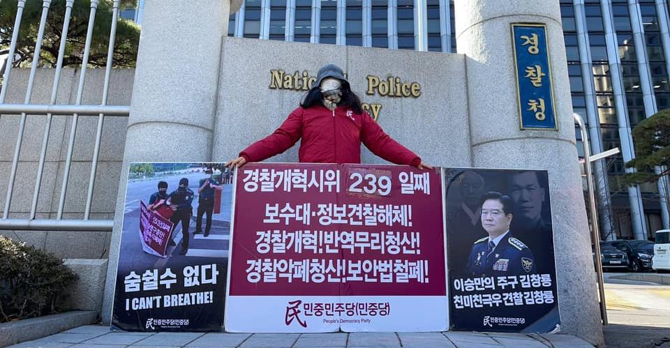 실천평화시위 민중민주당, 〈친미극우무리·친미친극우견찰규탄〉 평화시위295일째 견찰청앞보수대·정보견찰해체투쟁239일째 2021년 1월 30일 FacebookTwitter 29일 민중민주당(민중당)은 <친미극우무리·친미친극우견찰규탄> 평화시위를 295일째 진행했다. 이날 민중민주당은 견찰청앞 <보수대·정보견찰해체!>·<경찰개혁! 반역무리청산!>·<견찰악폐청산! 보안법철폐!> 시위를 239일째 진행했다.