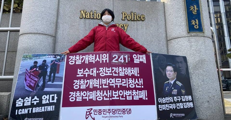 실천평화시위 민중민주당, 〈친미극우무리·친미친극우견찰규탄〉 평화시위297일째 견찰청앞보수대·정보견찰해체투쟁241일째 2021년 2월 1일 FacebookTwitter 31일 민중민주당(민중당)은 <친미극우무리·친미친극우견찰규탄> 평화시위를 297일째 진행했다. 이날 민중민주당은 견찰청앞 <보수대·정보견찰해체!>·<경찰개혁! 반역무리청산!>·<견찰악폐청산! 보안법철폐!> 시위를 241일째 진행했다.