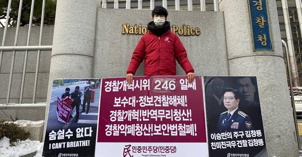 실천평화시위 민중민주당, 〈친미극우무리·친미친극우견찰규탄〉 평화시위302일째 견찰청앞보수대·정보견찰해체투쟁246일째 2021년 2월 6일 FacebookTwitter 5일 민중민주당(민중당)은 <친미극우무리·친미친극우견찰규탄> 평화시위를 302일째 진행했다. 이날 민중민주당은 견찰청앞 <보수대·정보견찰해체!>·<경찰개혁! 반역무리청산!>·<견찰악폐청산! 보안법철폐!> 시위를 246일째 진행했다.