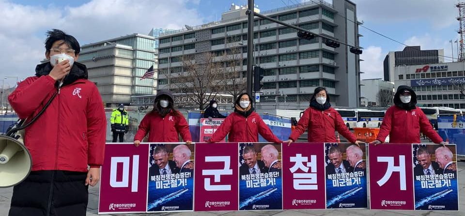 민중민주당(민중당)은 15일 미대사관앞에서 <북침전쟁연습영구중단! 미남워킹그룹즉각해체! 미군철거!>촉구 평화시위를 1672일째 진행했다.