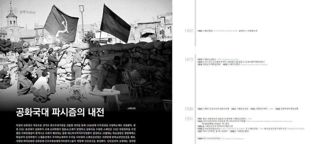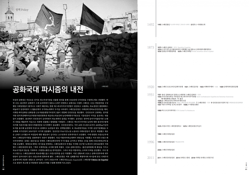 독일의 공화정은 자유로운 선거로 최고주권기관을 선출할 권리를 통해 1930년대 나치정권을 수립하는데로 귀결됐다. 반면 1931 총선에서 공화파가 크게 승리하면서 알폰소13세가 망명하고 공화국을 수립한 스페인은 1933 연립정부를 구성했던 사회당원들이 쫓겨나고 국회가 해산되는 한편 에스파냐자치우익연합이 결성되고 10월에는 파쇼정당인 팔랑헤에스 파뇰라가 등장하면서 11월총선에서 우익파쇼세력이 두각을 나타내자 스페인공산당은 사회당에 반파쇼인민전선을 제의, 사회당·좌익공화당·공화동맹·근로자총동맹및기타정치그룹이 연합해 인민전선을 형성했다. 인민전선의 강령에는 정치범석방·정치적견해차이로추방된사람전원복권·세금과소작료인하·농민에대한국가방조등 기층민중의 이익을 옹호하는 내용들이 포함됐다. 총선에서 인민전선이 승리하면서 파쇼세력의 집권을 저지했다. 공산당은 정부에 들어가지않았지만 16명의 의원을 배출하며 처음으로 의회에 진출했고 합법화를 이뤄냈다. 스페인은 짜르러시아처럼 농민에 대한 봉건적수탈에 의거해 자본주의를 발전시켜왔던만큼 토지개혁이 중요했다. 인민전선정부는 지주·교회·수도원으로부터 400만ha이상의 토지를 몰수해 농민에게 무상으로 분배하고 농민들의 빚도 전액탕감했다. 또 파쇼반란자들을 지지한 공장기업체들을 국유화해 국가산업의 30%이상이 국가에 집중됐다. 임금인상·주44시간노동·노동보호·사회보장등이 법으로 제정됐고 새로운 군대가 조직됐으며 여성들에 대한 평등권이 실시되고 소수민족의 민족적자유가 보장됐다. 이에 반발한 프랑코군부세력이 스페인남부지방을 점령하면서 내전이 발발했다. 독일·이탈리아파쇼세력이 반란군을 지원했고 미국·영국·프랑스제국주의세력은 <중립>·<불간섭>을 내세워 스페인공화국측에 무기수출을 금지하고 반대로 3국을 통해 프랑코반란군에 물자를 공급했다. 세계진보세력은 파시즘을 반대하는 스페인공화국의 투쟁을 지지해 1937말 54개국의 3만5000명의 지원병이 스페인내전에 참전, 7개의 국제여단을 조직해 함께 싸웠다. 1938 공화국정부는 <불간섭위원회>에 환상을 가지고 파쇼국가들의 철군을 기대하며 <지원병소환안>을 받아들였다. 그러나 독일·이탈리아는 오히려 무력을 증강했다. 미국·영국·프랑스는 스페인공화국과 외교관계를 끊고 프랑코정부를 승인·지원했다. 이런 상황속에 1939.3 공화국정부측에 내부반란이 일어나면서 결국 프랑코측에 항복하게 됐다. 스페인전쟁은 비록 실패했지만 혁명역사와 파시즘에 맞선 국제주의 운동역사에 귀중한 경험으로 남아있다. 1975 프랑코사후 스페인국(Estado Español)은 스페인왕국(Reino de España) 으로 왕정이 복고돼 상·하양원의 입헌군주제를 수립해 현재에 이르고있다.