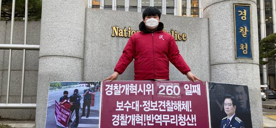 실천평화시위 민중민주당, 〈친미극우무리·친미친극우견찰규탄〉 평화시위316일째 견찰청앞보수대·정보견찰해체투쟁260일째 2021년 2월 20일 FacebookTwitter 19일 민중민주당(민중당)은 <친미극우무리·친미친극우견찰규탄> 평화시위를 316일째 진행했다. 이날 민중민주당은 견찰청앞 <보수대·정보견찰해체!>·<경찰개혁! 반역무리청산!>·<견찰악폐청산! 보안법철폐!> 시위를 260일째 진행했다.