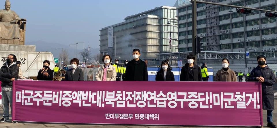 20일 반미투쟁본부 민중대책위원회가 미대사관앞에서 공동기자회견<미군주둔비증액반대!북침전쟁연습영구중단!미군철거!>를 열었다.
