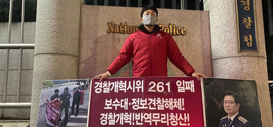 실천평화시위 민중민주당, 〈친미극우무리·친미친극우견찰규탄〉 평화시위317일째 견찰청앞보수대·정보견찰해체투쟁261일째 2021년 2월 21일 FacebookTwitter 20일 민중민주당(민중당)은 <친미극우무리·친미친극우견찰규탄> 평화시위를 317일째 진행했다. 이날 민중민주당은 견찰청앞 <보수대·정보견찰해체!>·<경찰개혁! 반역무리청산!>·<견찰악폐청산! 보안법철폐!> 시위를 261일째 진행했다.
