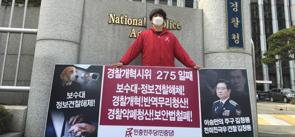 실천평화시위 민중민주당, 〈친미극우무리·친미친극우견찰규탄〉 평화시위331일째 견찰청앞보수대·정보견찰해체투쟁275일째 2021년 3월 7일 FacebookTwitter 6일 민중민주당(민중당)은 <친미극우무리·친미친극우견찰규탄> 평화시위를 331일째 진행했다. 이날 민중민주당은 견찰청앞 <보수대·정보견찰해체!>·<경찰개혁! 반역무리청산!>·<견찰악폐청산! 보안법철폐!> 시위를 275일째 진행했다.