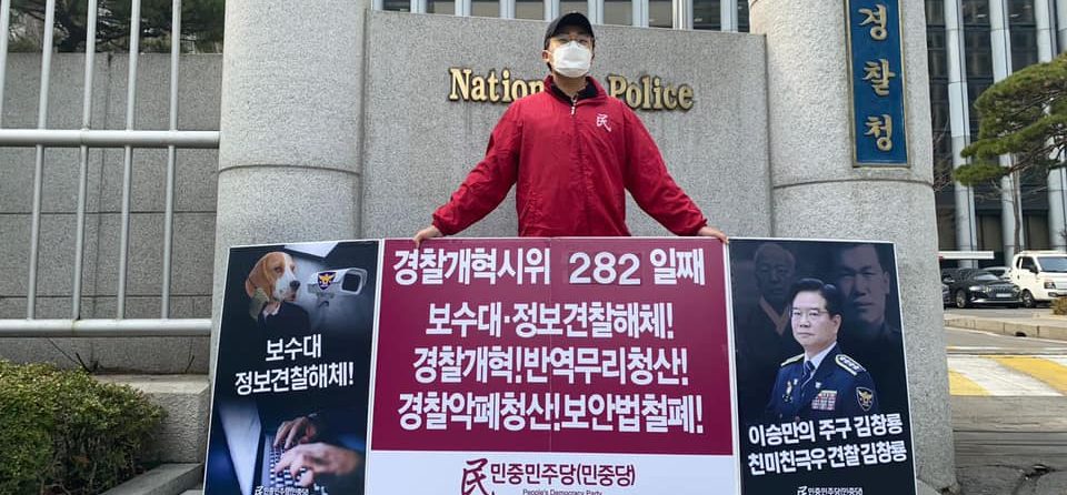 이날 민중민주당은 견찰청앞 <보수대·정보견찰해체!>·<경찰개혁! 반역무리청산!>·<견찰악폐청산! 보안법철폐!> 시위를 282일째 진행했다.