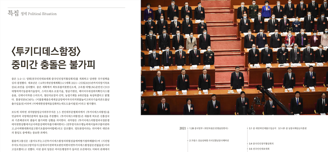 보도에 의하면 쉬치량중앙군사위부주석은 3.5 전인대부문별회의에서 <투키디데스의함정>을 언급하며 국방예산증액의 필요성을 주장했다. <투키디데스의함정>은 새롭게 떠오른 신흥강국과 기존패권국의 충돌이 불가피한 상황을 의미한다. 쉬치량은 <투키디데스의함정과국경분쟁에직면한상황에서군사력증강에박차를가해야한다>·<전투방식과수행능력에서돌파구를마련하고,군사력현대화의공고한기초를닦아야할때>라고 강조했다. 영토완정이라는 의미에서 대만과의 통일도 중에게는 중요한 과제다.