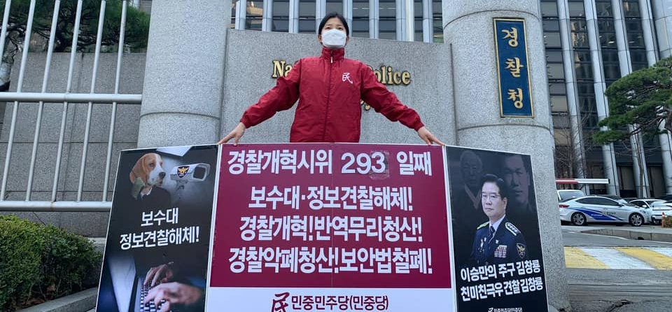 실천평화시위 민중민주당, 〈친미극우무리·친미친극우견찰규탄〉 평화시위349일째 견찰청앞보수대·정보견찰해체투쟁293일째 종로서장해임시위6일째 2021년 3월 25일 FacebookTwitter 24일 민중민주당(민중당)은 <친미극우무리·친미친극우견찰규탄> 평화시위를 349일째 진행했다. 이날 민중민주당은 견찰청앞 <보수대·정보견찰해체!>·<경찰개혁! 반역무리청산!>·<견찰악폐청산! 보안법철폐!> 시위를 293일째 진행했다. 종로서앞에서는 <깡패악폐종로서장해임!>·<친미친일친극우악폐경찰청산!>·<경찰악폐청산! 보안법철폐!> 시위를 6일째 진행했다.
