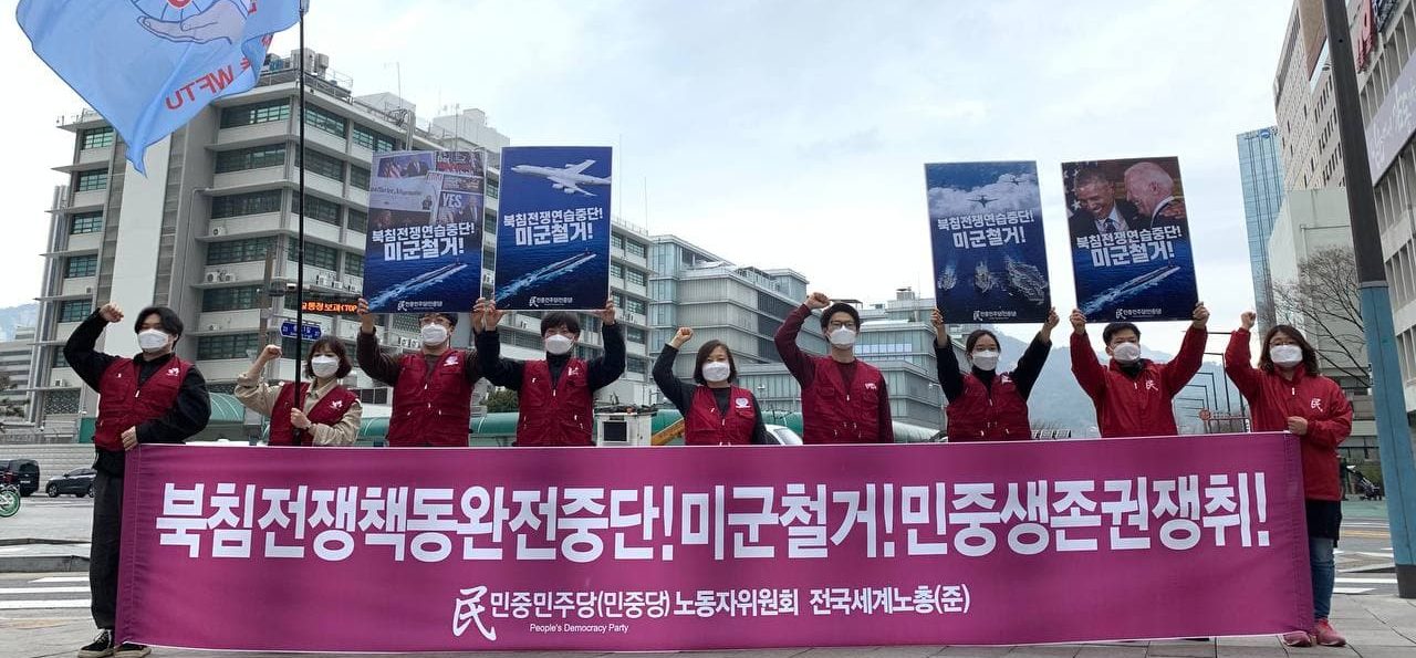 27일 민중민주당노동자위원회 전국세계노총이 미대사관옆에서 <북침전쟁책동완전중단!미군철거!민중생존권쟁취!>공동기자회견을 진행했다.