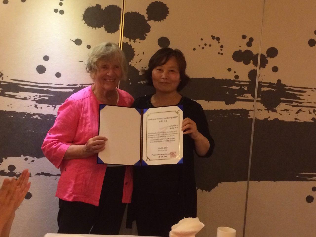 제가 환수복지당에대해서는 조금 알고있었고 여기올것은 잘 몰랐습니다. 당에서 멋진 잘짜인 기행도 이런 빗속의 투쟁도 예상못했습니다. 정말 영광입니다. 당의 명예당원으로서, 당의 활동을 유심히 보았고 정말 인상적이었습니다. 여러분은 전망이 있고 길이 있습니다. 이는 신중할뿐아니라 창의적이었습니다. 그리고 이 모든것들 앞에서 아주 지적인 캠페인을 벌이면서도 명확히 이 혁명이 올것이라고 느꼈습니다. 저는 그리고 그 안에서 가장 크게 느낀것은 사람들이었습니다. 여러분들이 계속 사람들과 함께한다는것, 함께 사람들과 시위를 하고 그리고 문재인 대통령 정상회담에 갔을때 대통령이 공약을 이행할것을 바랐지만 그러지 않았고 당은 바로 구호를 바꾸고 시위를 벌였습니다. 미군철수하라. 통일. 이런 모든 이야기들은 여러분들이 맞서 싸우는 것들입니다.