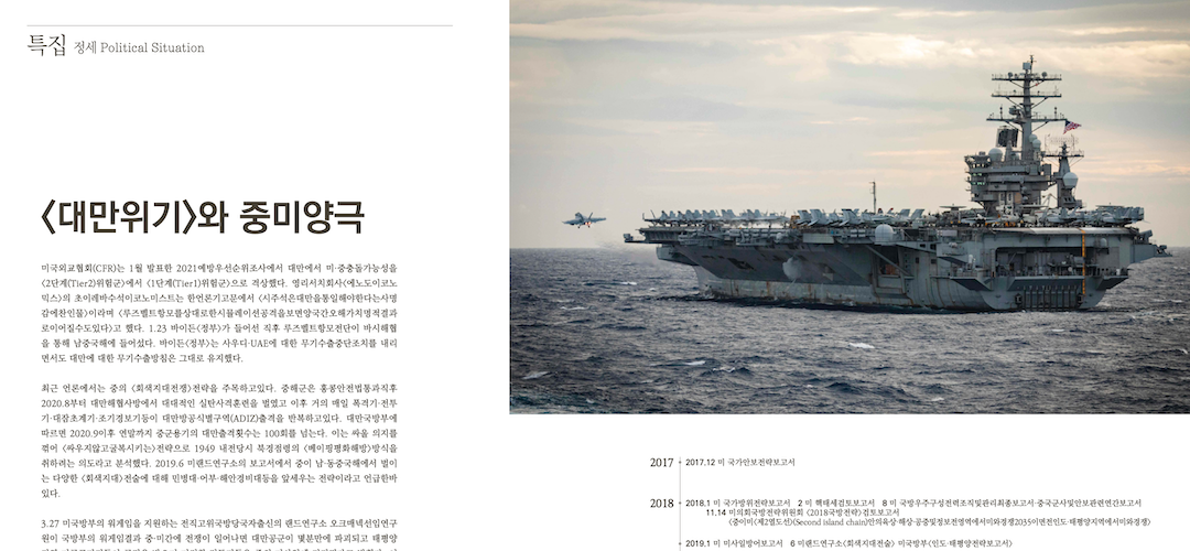 미국외교협회(CFR)는 1월 발표한 2021예방우선순위조사에서 대만에서 미·중충돌가능성을 <2단계(Tier2)위험군>에서 <1단계(Tier1)위험군>으로 격상했다. 영리서치회사<에노도이코노믹스>의 초이레바수석이코노미스트는 한언론기고문에서 <시주석은대만을통일해야한다는사명감에찬인물>이라며 <루즈벨트항모를상대로한시뮬레이션공격을보면양국간오해가치명적결과로이어질수도있다>고 했다. 1.23 바이든<정부>가 들어선 직후 루즈벨트항모전단이 바시해협을 통해 남중국해에 들어섰다. 바이든<정부>는 사우디·UAE에 대한 무기수출중단조치를 내리면서도 대만에 대한 무기수출방침은 그대로 유지했다.