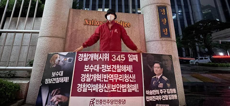 실천평화시위 민중민주당, 〈친미극우무리·친미친극우견찰규탄〉 평화시위401일째 견찰청앞보수대·정보견찰해체투쟁345일째 종로서장해임시위58일째 2021년 5월 16일 FacebookTwitter 15일 민중민주당(민중당)은 <친미극우무리·친미친극우견찰규탄> 평화시위를 401일째 진행했다. 이날 민중민주당은 견찰청앞 <보수대·정보견찰해체!>·<경찰개혁! 반역무리청산!>·<견찰악폐청산! 보안법철폐!> 시위를 345일째 진행했다. 종로서앞에서는 <깡패악폐종로서장해임!>·<친미친일친극우악폐경찰청산!>·<경찰악폐청산! 보안법철폐!> 시위를 58일째 진행했다.