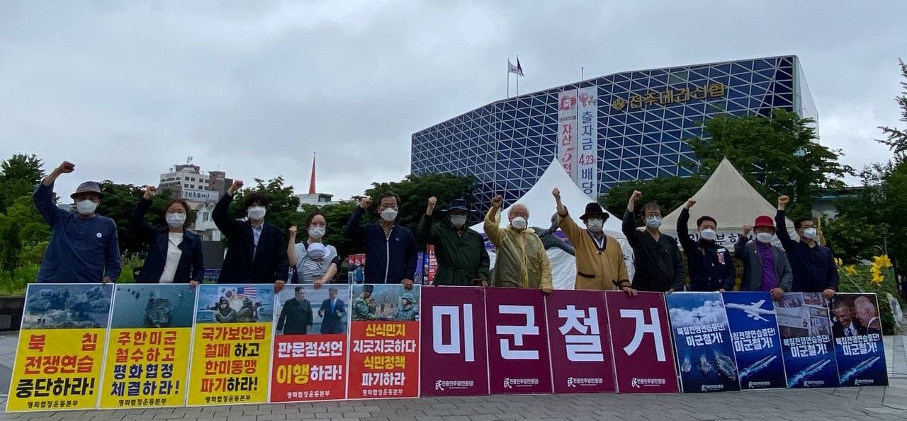 새만금신공항건설을 당장 중단하고 미군을 철거해야 한다. 신공항건설은 미군기지의 확장이며 우리민중의 생존권과 발전권을 유린하는 무도한 만행이다. 군산미공군기지로 인해 지역공동체는 파탄났고 여성들은 <미군위안부>로 전락해 2중3중의 착취에 시달렸으며 우리민중은 미공군의 전투기비행소음과 발암물질유출로 인해 매일 생명을 위협당하고 있다. 미군으로 인해 겪어야 하는 전북도민의 고통은 비단 이 지역만의 문제가 아니다. 미군이 있는 곳에 억압과 착취가 있으며, 억압과 착취가 있는 곳에 투쟁이 있다. 미군의 전초기지로 전락한 남코리아의 운명을 구원하는 유일한 길은 미군철거다. 우리민중은 반드시 반미구국항쟁에 총궐기해 전쟁의 화근, 만악의 근원인 미군을 철거하고 민족자주와 평화통일의 새세상을 앞당길 것이다.