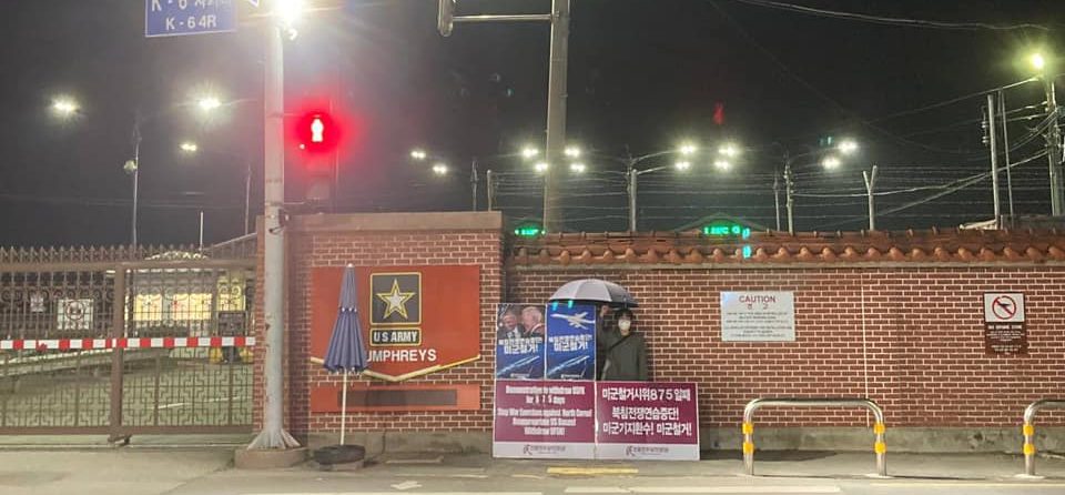 주남미군사령부가 있는 평택험프리스기지앞에서는 <북침전쟁연습중단! 미군기지환수! 미군철거!> 구호피시를 들고 미군철거시위를 875일째 진행했다.
