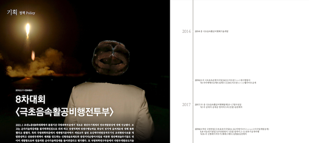 2021.1 조선노동당8차대회에서 총결기간 국방과학부문에서 새로운 첨단무기체계의 연속개발완성에 대해 언급됐다. 보고는 군사기술적강세를 불가역적인것으로 되게 하고 전쟁억제력·전쟁수행능력을 최상의 경지에 올려세운데 대해 총화했다고 밝혔다. 특히 국방과학부문에서 세계병기분야에서 개념조차 없던 초강력다연발공격무기인 초대형방사포를 개발완성하고 상용탄두위력이 세계를 압도하는 신형전술로케트와 중장거리순항미사일을 비롯한 첨단핵전술무기들도 연이어 개발함으로써 믿음직한 군사기술적강세를 틀어쥐었다고 평가했다. 또 국방과학연구부문에서 다탄두개별유도기술을 더욱 완성하기 위한 연구사업을 마감단계에서 진행하고있다면서 신형탄도로케트들에 적용할 극초음속활공비행전투부를 비롯한 각종탄두개발연구를 끝내고 시험제작준비에 들어갔다고 밝히고있다. 극초음속활공체(Hypersonic Glide Vehicle)는 미사일방어망을 완전히 무력화하고 지구위의 어느곳이든 1시간안에 타격할수 있는 최첨단무기며 현대미사일공학기술의 최고결정체다. 지금까지 러시아·중국만 실전배치한것으로 알려졌다. 또 보고는 중형잠수함무장현대화목표의 기준을 정확히 설정하고 시범개조해 해군의 수중작전능력을 눈에 띄게 높일 확고한 전망을 열어놨다고 밝혔다. 신형핵잠수함설계연구가 최종심사단계에 있으며 각종전자무기들·무인타격장비들·정찰탐지수단들·군사정찰위성설계완성을 비롯해 여러 국방연구성과들이 나왔다고 언급했다. 핵기술의 고도화, 핵무기의 소형경량화·전술무기화를 보다 발전시켜 현대전에서 작전임무의 목적·타격대상에 따라 각이한 수단으로 적용할수 있는 전술핵무기들을 개발해야한다고 밝혔다. 이어 초대형핵탄두생산도 지속적으로 밀고나가 핵위협이 동반되는 코리아반도지역의 각종군사적위협에서 주동성을 유지하며 이를 철저히 억제하고 통제관리할수 있게 해야한다고 강조했다. 더불어 1만5000㎞사정권안의 임의의 전략적대상들을 정확히 타격소멸하는 명중률을 더욱 제고하고 핵선제및보복타격능력을 고도화할데 대한 목표를 제시했다. 가까운 기간내에 군사정찰위성을 운용해 정찰정보수집능력을 확보하며 500㎞전방종심까지 정밀정찰할수 있는 무인정찰기들을 비롯한 정찰수단들을 개발하기 위한 최중대연구사업을 본격적으로 추진할것이라고도 밝혔다. 무장장비의 지능화·정밀화·무인화·고성능화·경량화실현을 군수산업의 중핵적인 목표로 정하고 연구개발사업을 여기에 지향시켜야한다고 강조했다. 핵동력공업창설에 본격적으로 진입하기 위한 계획들도 언급했다. 새로운 차원의 원자력발전소건설계획이 추진되고있다는 뜻이다.