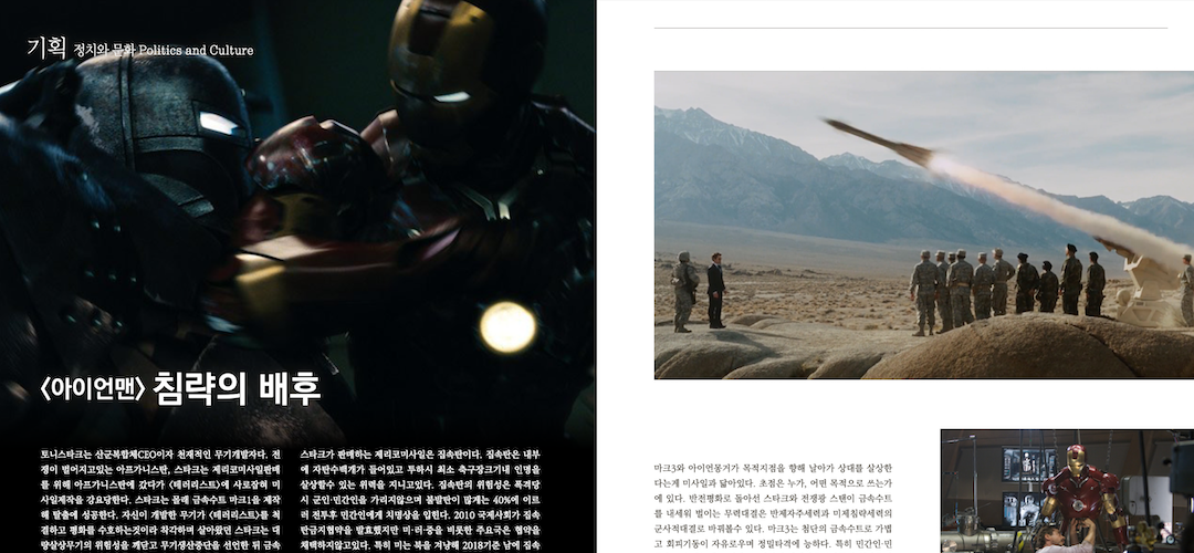 마크3와 아이언몽거가 목적지점을 향해 날아가 상대를 살상한다는게 미사일과 닮아있다. 초점은 누가, 어떤 목적으로 쓰는가에 있다. 반전평화로 돌아선 스타크와 전쟁광 스탠이 금속수트를 내세워 벌이는 무력대결은 반제자주세력과 미제침략세력의 군사적대결로 바꿔볼수 있다. 마크3는 첨단의 금속수트로 가볍고 회피기동이 자유로우며 정밀타격에 능하다. 특히 민간인·민중을 보호하는데 쓰인다. 그렇기에 반제자주국가들의 첨단무기와 닮았다. 아이언몽거는 비대하고 기능적으로 둔탁하며 구식을 답습하고있다. 특히 공격지점이 부정확하고 민중을 공격한 다는데서 미제침략세력의 살상무기를 연상시킨다.
