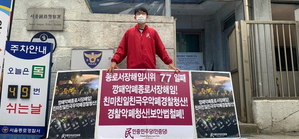 실천평화시위 민중민주당, 〈친미극우무리·친미친극우견찰규탄〉 평화시위420일째 견찰청앞보수대·정보견찰해체투쟁364일째 종로서장해임시위77일째 2021년 6월 4일 FacebookTwitter 3일 민중민주당(민중당)은 <친미극우무리·친미친극우견찰규탄> 평화시위를 420일째 진행했다. 이날 민중민주당은 견찰청앞 <보수대·정보견찰해체!>·<경찰개혁! 반역무리청산!>·<견찰악폐청산! 보안법철폐!> 시위를 364일째 진행했다. 종로서앞에서는 <깡패악폐종로서장해임!>·<친미친일친극우악폐경찰청산!>·<경찰악폐청산! 보안법철폐!> 시위를 77일째 진행했다.