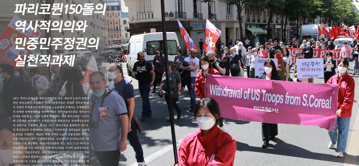 1871 파리노동계급을 대중적지반으로 하는 최초의 노동자·민중정권인 파리코뮌이 수립됐다. 파리코뮌전사들은 외세와 정부군에 맞서 견결히 투쟁했으나 혁명적당과 노농동맹의 부재라는 주체역량상의 한계와 반혁명세력을 청산하지않은 전략전술적오류로 정부군의 반격을 허용했고 그결과 무참히 학살됐다. 비록 파리코뮌은 72일만에 그존재를 마감했으나 코뮌전사들의 혁명정신은 전세계진보정당의 정책으로 구현됐다. 레닌은 1917 파리코뮌을 총화하며 지도자·당·통일전선의 주체역량을 강화하고 무장투쟁의 전략전술로 소비에트정권을 수립했다. 레닌에 의해 이어진 노동자·민중정권의 역사는 이후 식민지조선에서 인민혁명정부로, 남코리아의 군사파쇼시절 <광 주코뮌>으로 계승됐다. 파리코뮌150돌을 맞는 2021.5.29 파리<공화국광장>에 모인 사람들은 함께 파리코뮌을 기리며 코뮌전사들을 추억했다. 민중민주당은 <파리코뮌에서<광주코뮌>으로!코뮌은영원하다!>·<코뮌은영원하다!민중민주정권수립!>·<미군철거!민중민주정권수립!>의 구호를 들고 집회에 참석했다. 이날 민중민주당은 파리코뮌150돌과 <광주코뮌>41돌의 현재적의의를 생각하며 코뮌정신의 계승을 결의했다. 식민지반자본주의사회인 남코리아에서 코뮌정신을 구현한 정권형태는 민중민주정권이 유일하다. 민중민주당은 민중을 위하고 민중에 의하는 민중민주정권수립으로 코뮌전사들이 만들고자 했던 민중중심사회를 열어나갈것이다.