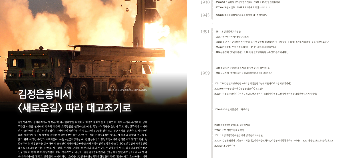 김일성주석의 생애마지막시기 북은 핵·미사일개발을 지렛대로 미국과의 대화를 이끌어냈다. 북의 목적은 분명하다. 남에 주둔한 미군을 철거하고 민족의 자주와 조국통일을 실현하는것이다. 북남수뇌회담을 눈앞에 두고 김일성주석이 서거하면서 코리아의 분위기는 반전됐다. 김정일국방위원장은 이때 <고난의행군>을 결심하고 선군정치를 선언한다. 제국주의와의 대결에서 그들을 제압할 수단은 혁명무력뿐이라고 본것이다. 이는 김일성주석이 항일시기 민족의 해방과 조국을 되찾기 위해 시작한 투쟁과 다르지않다. 북은 <선군혁명사상>이 김일성주석의 항일혁명시기에 창시됐다고 밝히고있다. 김일성주석은 최후공격을 준비하면서 조선인민혁명군의총공격·조국광복회의전인민적봉기·소부대및인민무장대의배후연합작전을 <조국해방3대노선>으로 제시했다. 미제를 상대로 한 현재의 북의 투쟁도 이연장선에 있다. 김정일국방위원장은 선군정치와 함께 핵·미사일개발에 보다 적극적으로 나선다. 김정일국방위원장은 <강성대국건설3대기둥>으로 <사상·총대·과학기술>을 밝히고 강행군의 마지막해인 1999를 <강성대국건설의위대한전환의해>로 빛내이자고 호소하면서 이해를 <과학기술의해>로 정하고 과학기술발전5개년계획을 보장하도록 했다. 2002에는 <국방공업우선경공업농업동시발전노선>을 제시했다. 첨단의 국방공업이 다른 산업분야를 선도하는 동시에 제국주의와의 군사적대결에서 결정적우위를 첨단무기로 실현하겠다는 의지의 반영이다. 김정은위원장은 김정일국방위원장의 서거이후 김일성주석탄생100돌열병식연설에서 <선군의기치를더높이추켜들고최후승리를향하여힘차게싸워나가자>고 호소했다. 김정은위원장은 2017 <군사적공세>속에 화성15형의 시험발사와 2019 <새로운길>을 예고하는 첨예한 정세에 신형전술미사일을 집중적으로 시험발사했다. 6차에 걸친 핵및수소탄시험·ICBM탑재용핵탄두시험을 진행하면서 2020.10.10 당창건경축열병식에서 화성16형, 2021.1.14 8차당대회기념열병식에서 신형전술미사일을 공개했다. <새로운길>을 따라 대고조기로의 결정적시기가 임박했다는 징후가 강해지고있다.