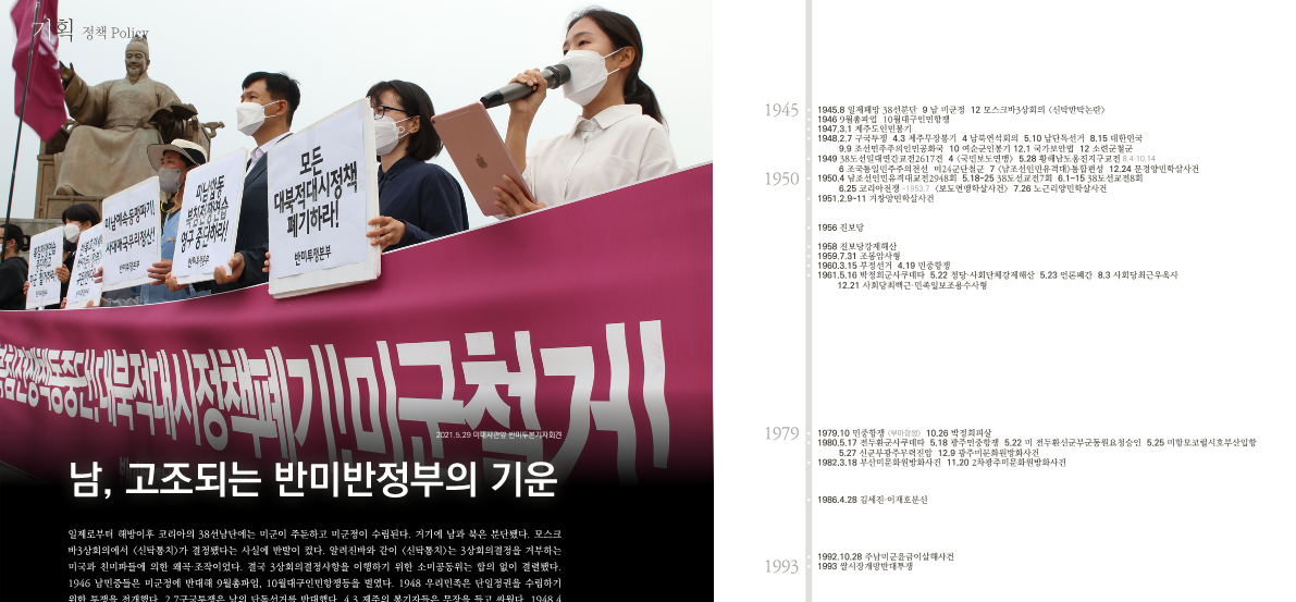일제로부터 해방이후 코리아의 38선남단에는 미군이 주둔하고 미군정이 수립된다. 거기에 남과 북은 분단됐다. 모스크바3상회의에서 <신탁통치>가 결정됐다는 사실에 반발이 컸다. 알려진바와 같이 <신탁통치>는 3상회의결정을 거부하는 미국과 친미파들에 의한 왜곡·조작이었다. 결국 3상회의결정사항을 이행하기 위한 소미공동위는 합의 없이 결렬됐다. 1946 남민중들은 미군정에 반대해 9월총파업, 10월대구인민항쟁등을 벌였다. 1948 우리민족은 단일정권을 수립하기 위한 투쟁을 전개했다. 2.7구국투쟁은 남의 단독선거를 반대했다. 4.3 제주의 봉기자들은 무장을 들고 싸웠다. 1948.4 남북연석회의에 이승만·한민당을 제외한 거의 모든 정치세력들이 참여했으나 5월 남측만의 망국적인 단독선거가 강행됐다. 그결과 북에는 연석회의결정에 기초한 정부가 수립됐고 남에는 이승만친미세력의 정부가 수립됐다. 38도선인근지역을 비롯한 남측의 적지않은 지역에서 빨치산유격투쟁과 토벌대의 전투가 벌어졌다. 전쟁과 토벌로, 보도연맹·국가보안법등의 반민주악법과 제도로 민족자주세력의 다수인사가 투옥·학살됐다. 친미반공정권에 의해 남녘에는 숭미공미의식이 사회를 지배했다. 그러나 노동자·민중의 분노를 잠재울수 없었으며 그들의 투쟁은 사회적으로 성숙해갔다. 1980 광주민중항쟁을 계기로 미국의 식민지배의 본질을 깨닫기 시작하면서 미문화원방화사건등 선도적반미투쟁이 벌어졌다. 전방입소를 거부하며 분신한 대학생들은 <양키고홈>을 외쳤다. 2002 효순이·미선이의 죽음은 미군범죄의 진상을 절실히 깨닫게 했다. 이듬해 미국의 침략전쟁에 동원된 이라크파병도 대중적인 반미시위를 불러일으켰다. 점령군인 맥아더동상의 철거농성과 방화투쟁도 조직됐다. 자주통일민주주의코리아연대는 미군철거를 요구하는 미대사관앞평화시위와 미군의 북침전쟁연습을 반대하는 미대사관앞기습시위를 벌이면서 미국의 침략과 모략의 소굴 미대사관을 압박했다. 민중민주당은 2019 <미군철거원년>을 선언했으며 반미투본은 반미대장정을 하면서 미국의 남코리아지배를 끝장내기 위해 민중들의 투쟁을 조직하고있다. 또 청년레지스탕스의 미대사관앞기습시위가 우리민중의 반미저항의지를 힘있게 시위하고있다. 제국주의자들에 의해 분단된 베트남의 남단에서 불타오른 반미투쟁처럼 코리아의 남단에서의 반미투쟁의 승리는 역사의 필연이 될수밖에 없다.