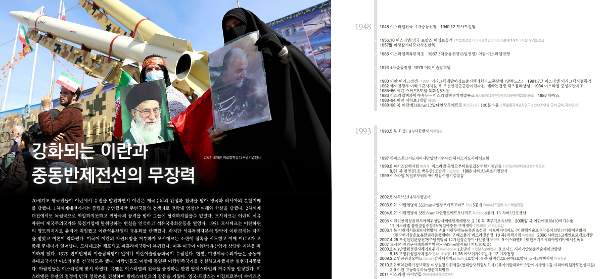 20세기초 영국인들이 이란에서 유전을 발견하면서 이란은 제국주의의 간섭과 침략을 받아 영국과 러시아의 분할지배를 당했다. 1차세계대전에서는 중립을 선언했지만 주변국들의 전쟁터로 전락돼 엄청난 피해와 학살을 당했다. 2차세계대전에서도 독립국으로 역할하지못하고 연합국의 공격을 받아 그들에 협력하지않을수 없었다. 모사데크는 이란의 석유자원이 제국주의국가와 독점기업에 탈취당하는 현실을 인식하고 석유국유화운동을 벌였다. 1951 모사데크는 이란하원의 압도적지지로 총리에 취임했고 이란석유산업의 국유화를 단행했다. 하지만 석유독점자본의 압박에 이란경제는 타격을 받았고 여론이 악화됐다. 미국이 이란의 지원요청을 거부하자 모사데크는 소련에 접촉을 시도했고 이때 미CIA가 조종해 쿠데타가 일어났다. 모사데크는 체포되고 파흘라비국왕이 복귀했다. 이후 미국이 이란석유산업에 상당한 지분을 차지하게 됐다. 1979 반미반제의 이슬람혁명이 일어나 이란이슬람공화국이 수립된다. 한편, 미영제국주의자들은 중동에 유대교국가인 이스라엘을 건국하도록 했다. 아랍인들도 이땅에 통일된 아랍민족국가를 건설하고자했지만 실현되지못했다. 아랍인들은 이스라엘에 맞서 싸웠다. 유엔은 이스라엘의 건국을 승인하는 한편 팔레스타인의 거주지를 인정했다. 이스라엘은 유엔의 결정에 반해 정착촌을 건설하며 팔레스타인과의 갈등을 키웠다. 영국·프랑스는 이집트로부터 수에즈운하의 운영권을 탈취하기 위해 이스라엘에 이집트침공을 제안했다. 이렇게 시작된 2차중동전쟁은 유엔과 미국의 압박으로 영국·프랑스·이스라엘이 물러나면서 종결됐는데 이스라엘은 전쟁의 대가로 프랑스에 핵재처리시설과 우라늄을 요구했다. 이스라엘은 핵탄두를 장착할수 있는 미사일과 핵폭격기·핵잠수함을 보유하고있다. 핵잠수함의 경우, 1991이라크전쟁에서 독일회사가 이라크의 화학무기개발을 지원한것이 드러나자 독일은 이에 대한 보상차원으로 이스라엘에 잠수함2척을 기증했다. 이스라엘은 그외 2척을 더 구매했으며 건조비의 1/3은 독일정부가 부담한것으로 알려졌다. 이스라엘은 공식상은 아니지만 암묵적인 핵보유국으로 인정된다. 이스라엘은 이처럼 핵무기보유에 열을 내는 한편, 다른 중동국가들의 핵보유는 악착같이 막아나서 이라크와 시리아의 핵시설을 폭격했다. 이스라엘은 이란의 핵무장화를 절대로 용인할수 없다는 입장이다. 이란도 이에 맞서 혁명수비대에 해외공작전담조직으로 <알쿠드스>를 조직해 활동하고있다. 솔레이마니가 이부대를 지휘하며 헤즈볼라·하마스, 이라크민병대등과 연계를 가져왔다. 이스라엘의 건국으로 자기땅에서 쫓겨나게 된 팔레스타인인들이 국경이 접한 레바논으로 이동하자 이스라엘은 이를 이유로 레바논을 침공했다. 이는 레바논민중들의 분노를 야기했고 헤즈볼라가 창설된 배경이 됐다.