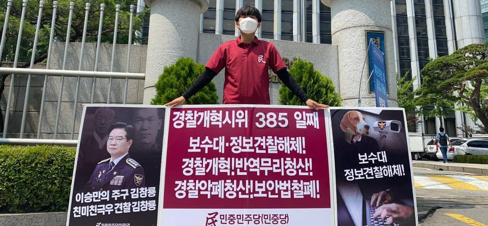 실천평화시위 민중민주당, 〈친미극우무리·친미친극우견찰규탄〉 평화시위441일째 견찰청앞보수대·정보견찰해체투쟁385일째 종로서장해임시위98일째 2021년 6월 25일 FacebookTwitter 24일 민중민주당(민중당)은 <친미극우무리·친미친극우견찰규탄> 평화시위를 441일째 진행했다. 이날 민중민주당은 견찰청앞 <보수대·정보견찰해체!>·<경찰개혁! 반역무리청산!>·<견찰악폐청산! 보안법철폐!> 시위를 385일째 진행했다. 종로서앞에서는 <깡패악폐종로서장해임!>·<친미친일친극우악폐경찰청산!>·<경찰악폐청산! 보안법철폐!> 시위를 98일째 진행했다.