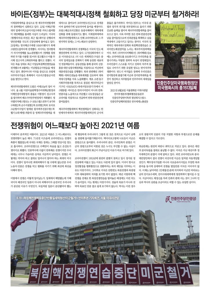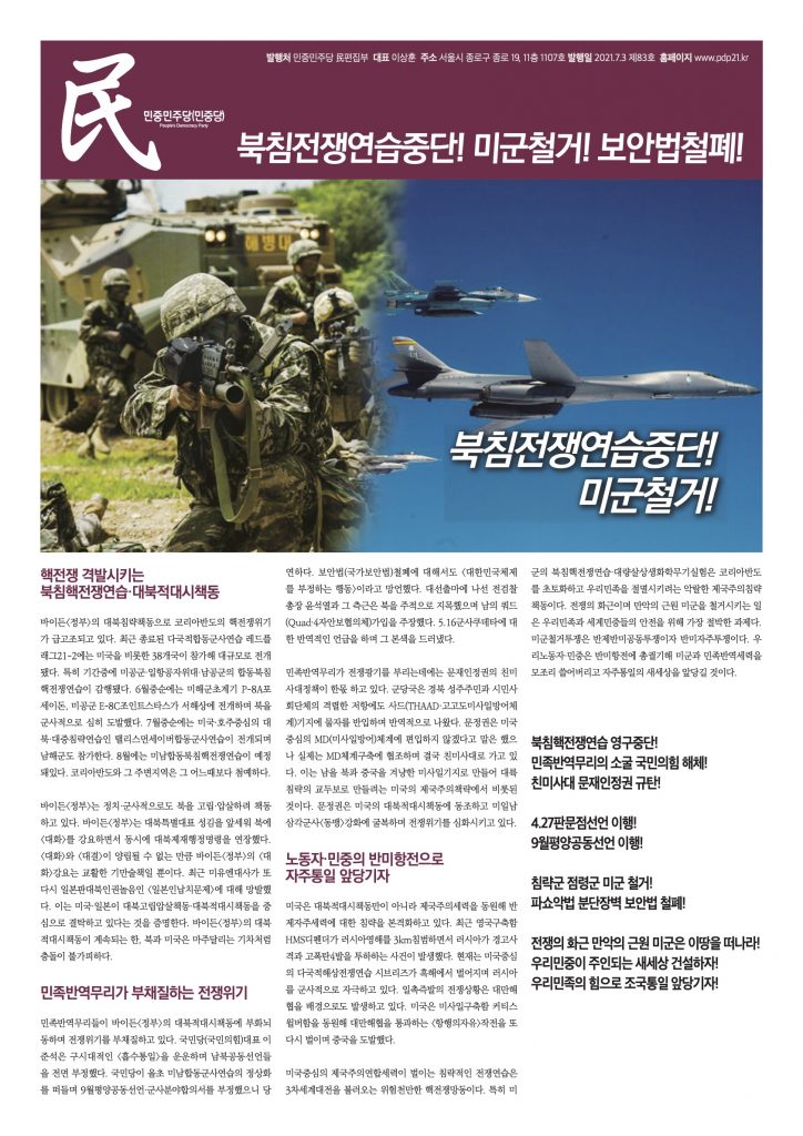 민중민주당(민중당)은 2021년 7월 3일 당신문民83호 <북침전쟁연습중단! 미군철거! 보안법철폐!>를 제작했다.
