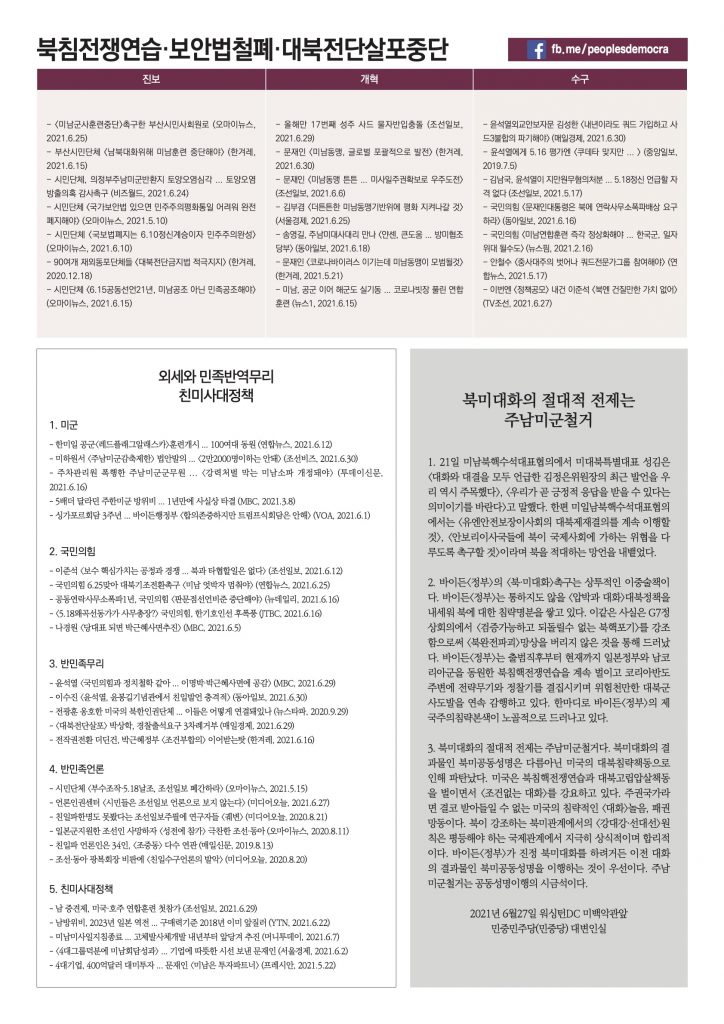 – 부산시민단체 <남북대화위해 미남훈련 중단해야> (한겨레, 2021.6.15)